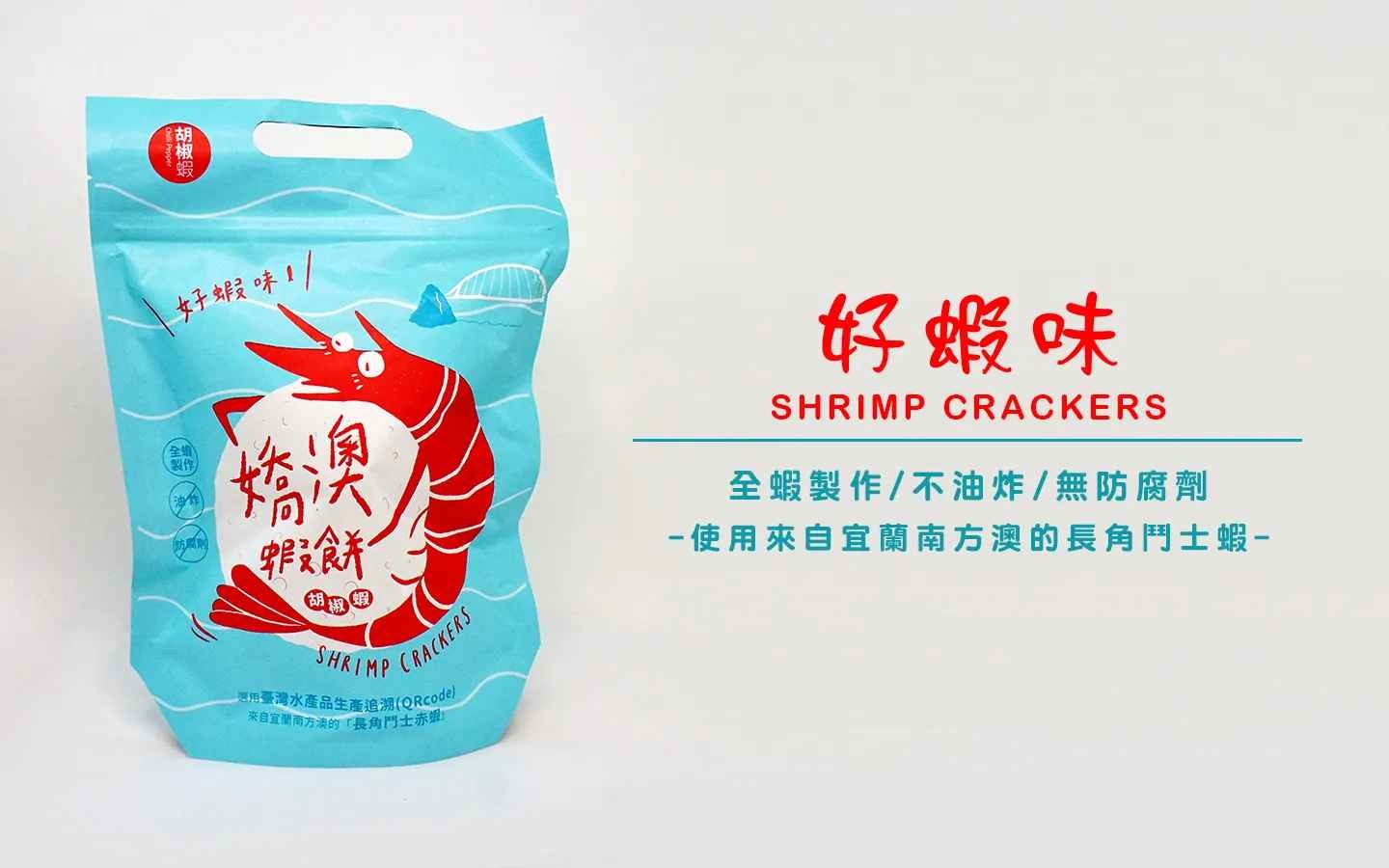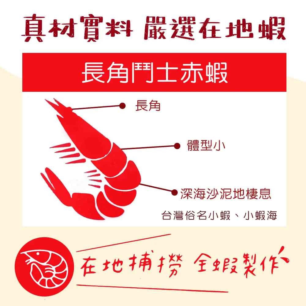 採用南方澳特產-長角鬥士赤蝦所製成,滿滿蝦味,在外面買不到!喜愛蝦餅的你絕不能錯過!