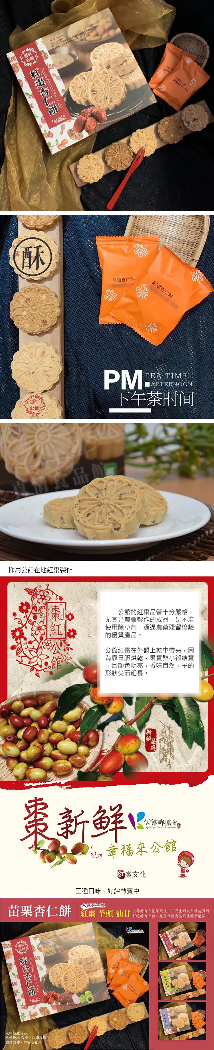 精選優質杏仁烘焙製成,加入公館在地紅棗,就成了下午茶、點心最佳選擇。