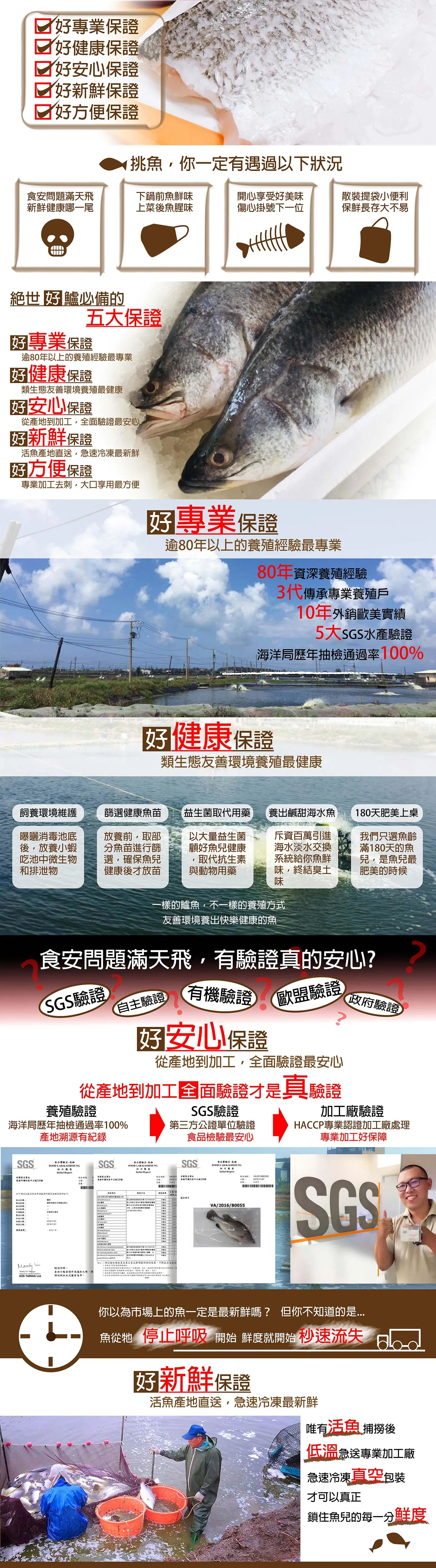 全心養殖-歷時三代的養鱸世家精心培植,為你用心照顧每一尾新鮮健康的魚。全程控管,活魚產地直送,傳業活魚捕撈團隊,快速捕撈後,新鮮上岸直送加工最新鮮。合作加工廠專業處理,急速冷凍真空包裝,鎖住魚兒的每一分鮮度。