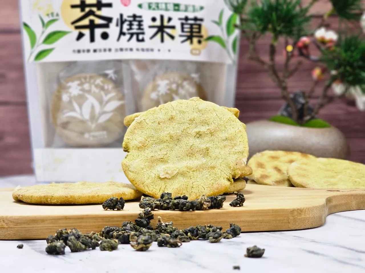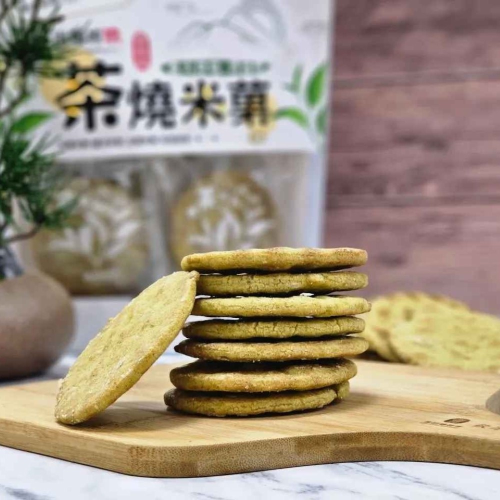 番路鄉不僅是柿子的故鄉,更是阿里山茶的產地,「茶燒米菓」選用擁有天然純淨風土與水質的宜蘭米,結合台灣阿里山「青心烏龍茶」,巧妙地融入每一片「茶燒米菓」中,無添加香精的天然茶香,交織出令人驚艷愉悅的口感。