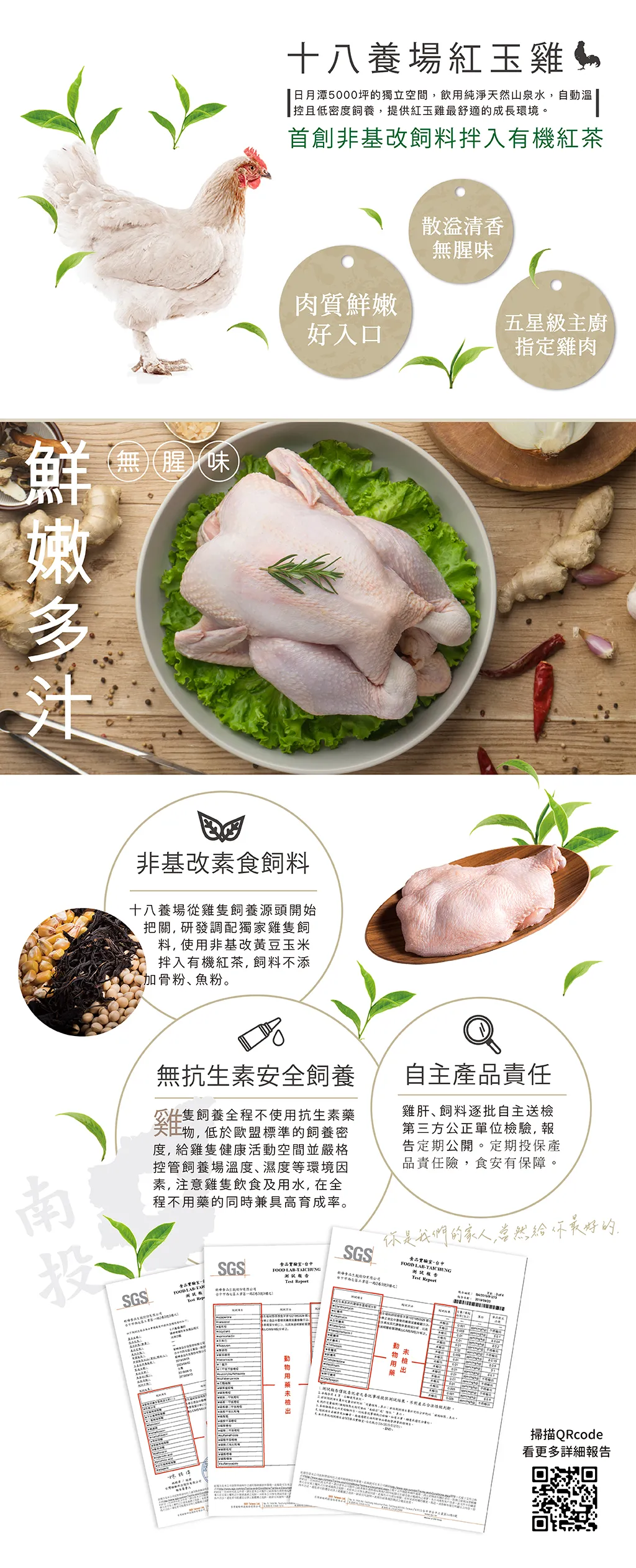 十八養場的紅玉雞,餵養雞隻的是以創新調配無基改黃豆玉米的草本飼料,拌入台茶十八號紅茶,並導入埔里純淨山泉水,搭配專業科技化的設備,生長過程絕不施打藥物及抗生素讓十八養場紅玉雞是在無藥、健康環境中安心茁壯。
