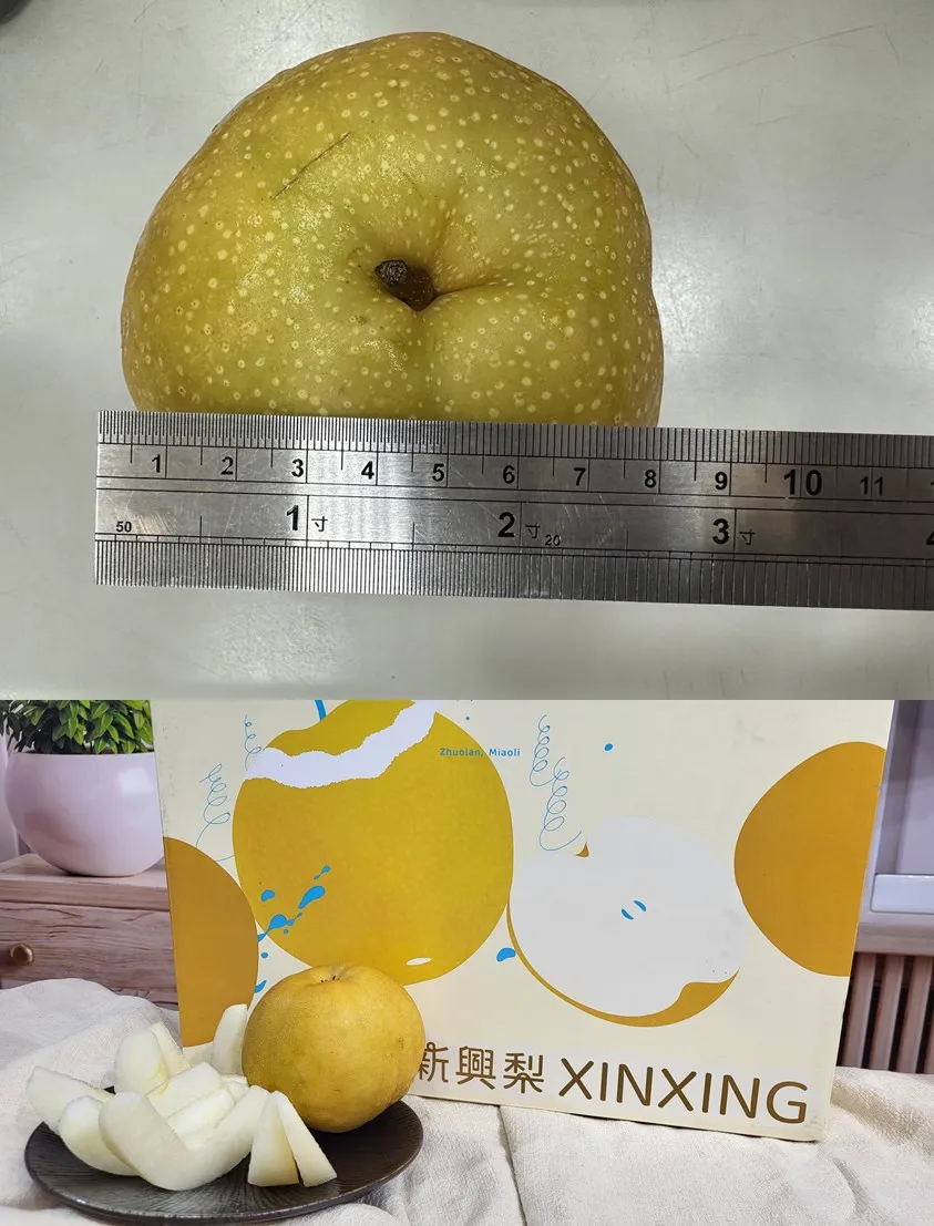 果皮果點明顯、果實大而飽滿的新興梨,頂部的爪形隆起特徵沒有蜜梨明顯,是台灣廣受大眾歡迎的禮品水果。