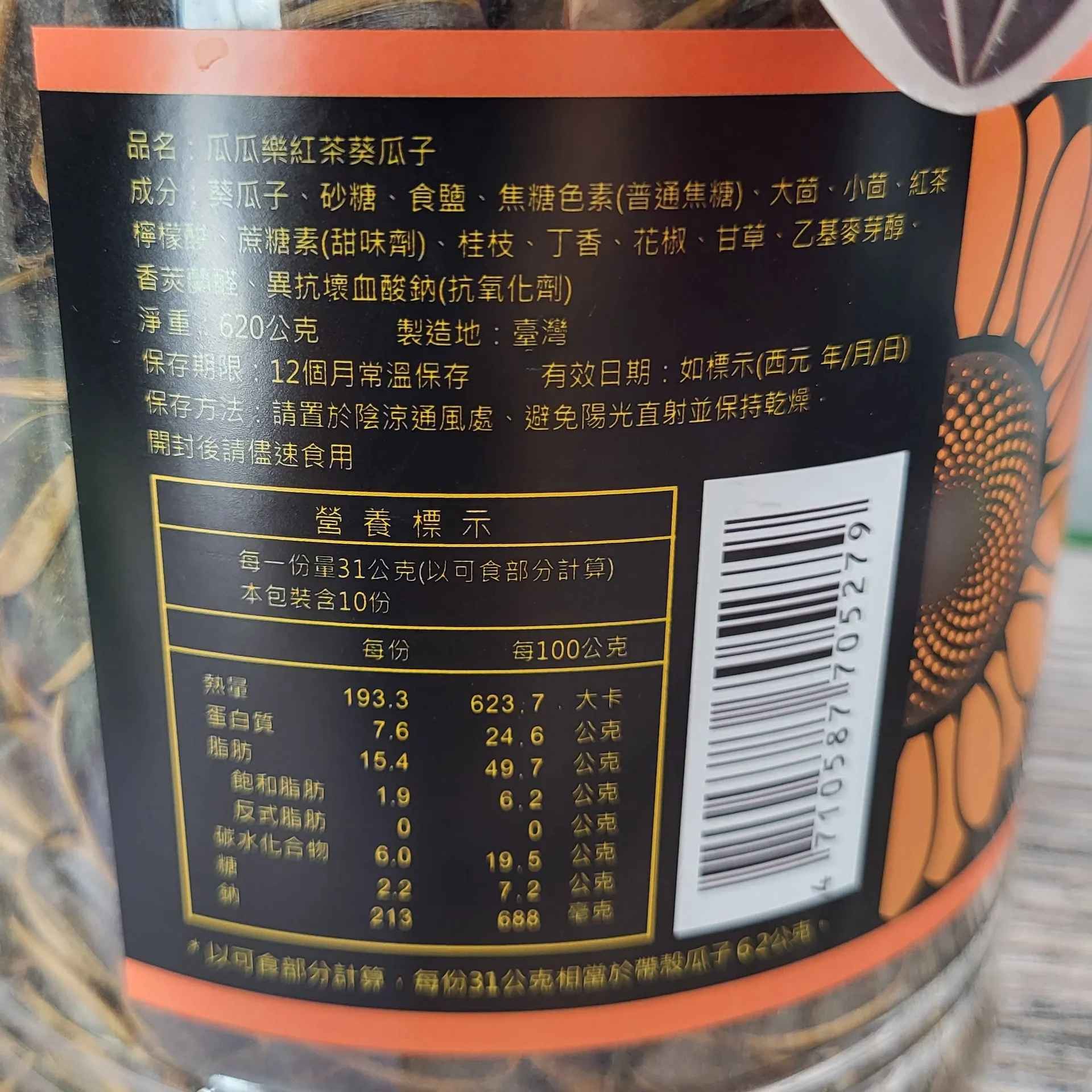 成份:葵瓜子、砂糖、食鹽、焦糖色素、大小茴、紅茶檸檬酸、蔗糖素、桂枝、丁香、花椒、甘草。