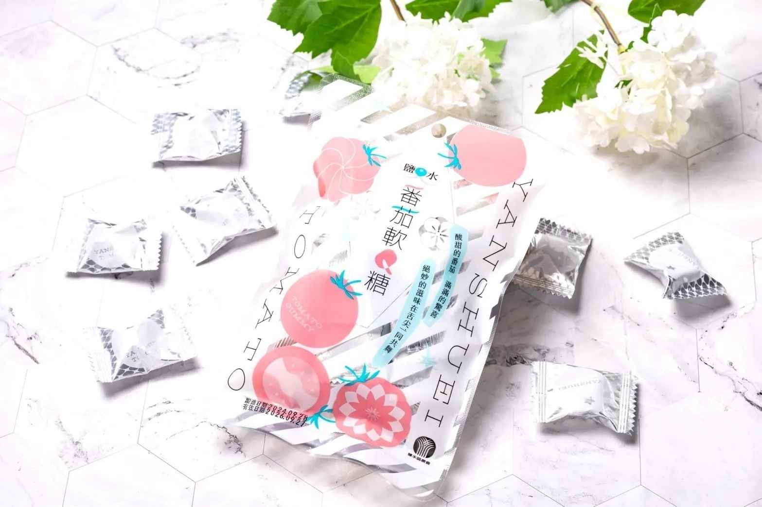 「鹽水番茄軟Q糖」包裝設計採用輕巧隨手包,每顆口感柔軟且Q彈、充滿濃郁的果香!