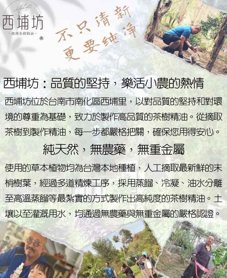 西埔坊茶樹精油 是位在台南市南化區西埔里的樂活小農,種植的是澳洲茶樹,從種植到提煉,甚至銷售全部過程都由主人一手包辦,讓大家使用起來安心!