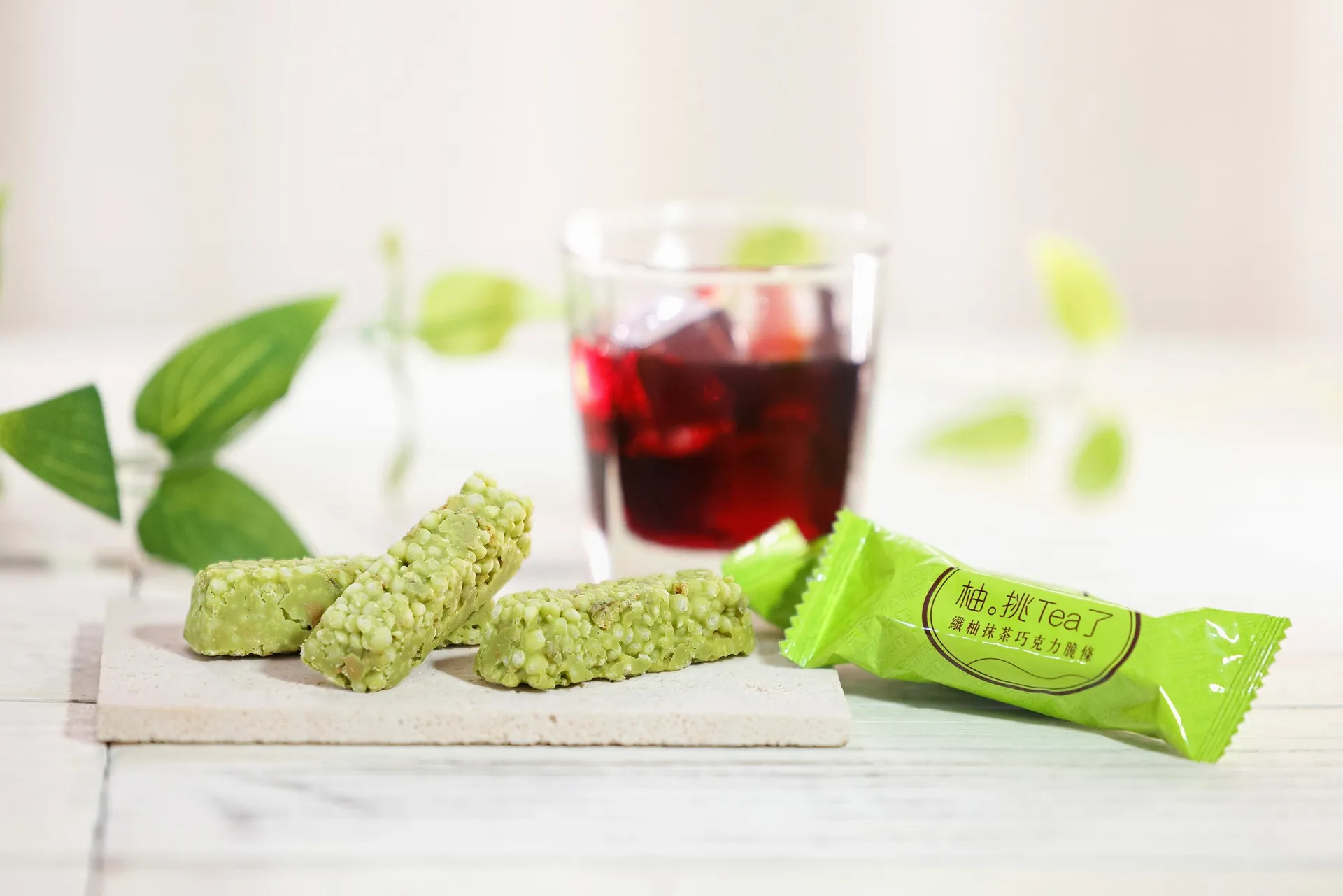 濃郁抹茶與白巧克力、米香、杏仁角、脆餅顆粒及麻豆農會梅柚片兒結合的層次滋味