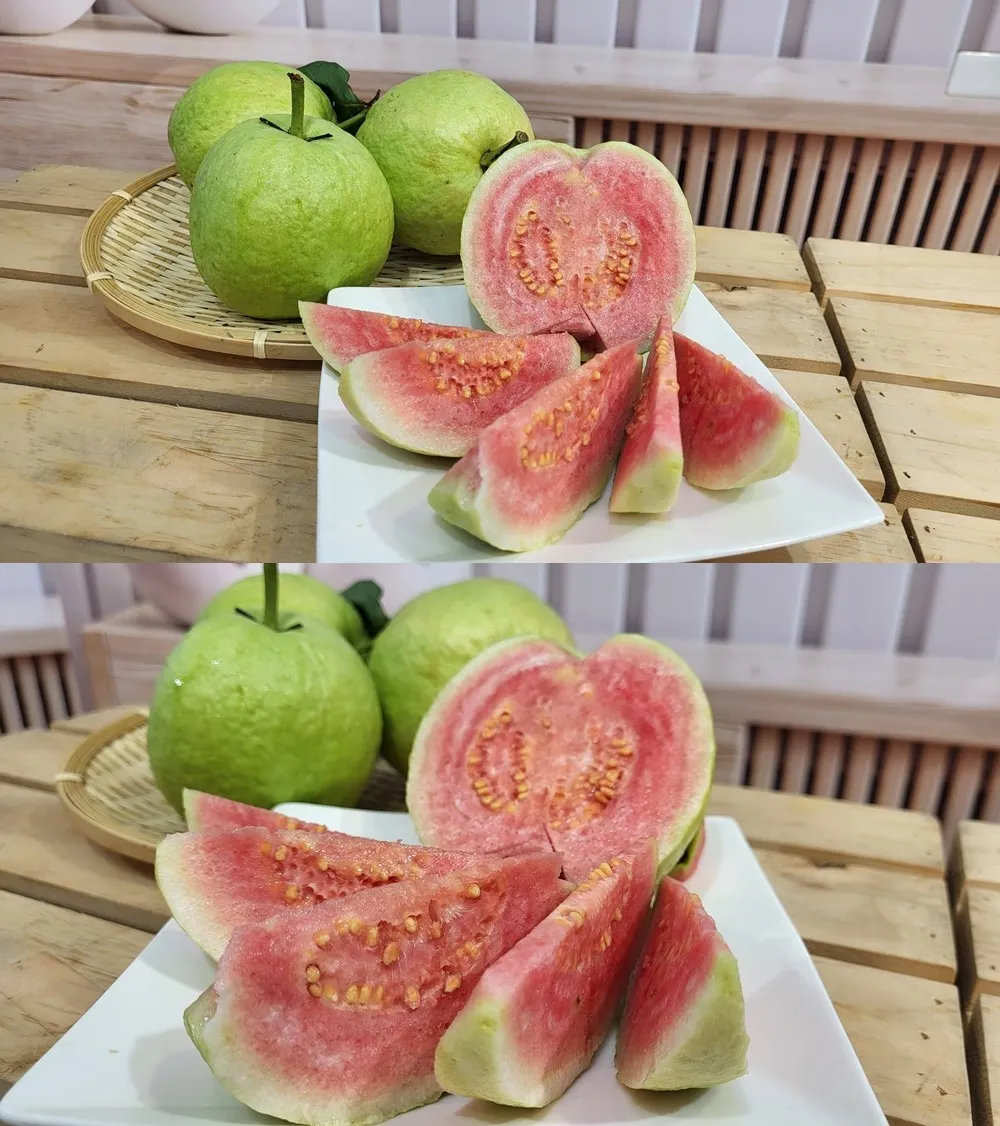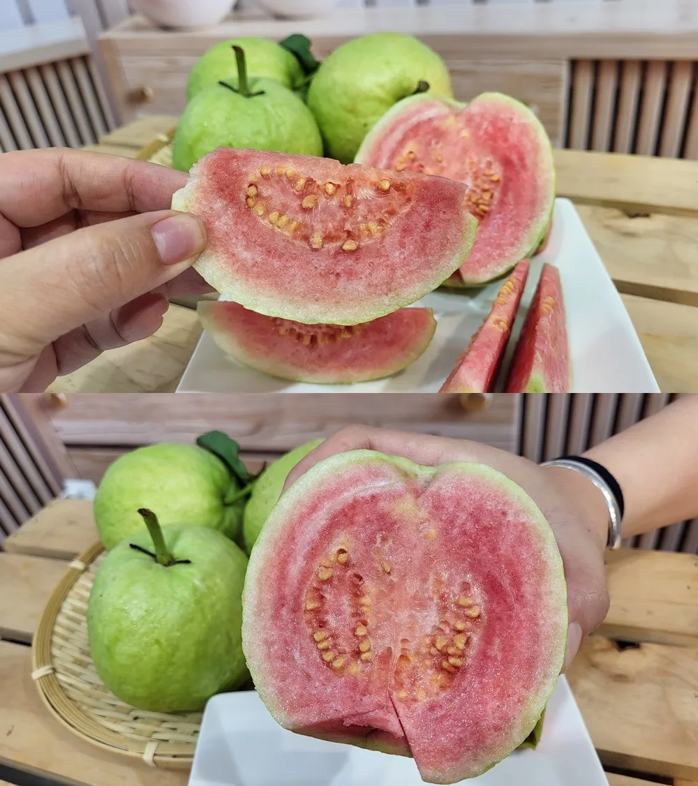 紅肉芭樂大多是土芭樂或珍珠芭樂嫁接改良的品種,其維生素及纖維含量都更豐富,紅心芭樂裡更含有茄紅素、 胡蘿蔔素,口感紮實清脆爽口,吃得安心又健康。