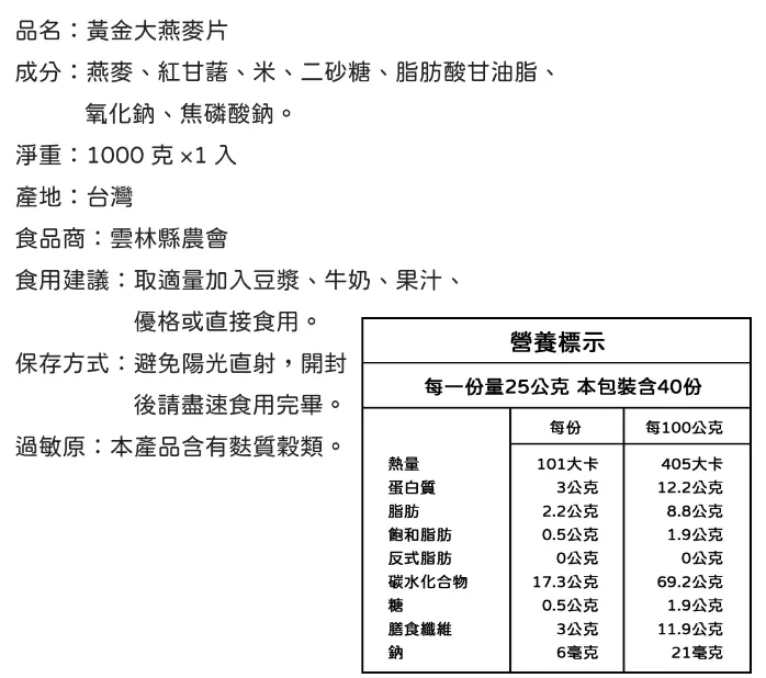 在地農產品加料 燕麥更添風味! 雲林縣農會出品 黃金大燕麥片~