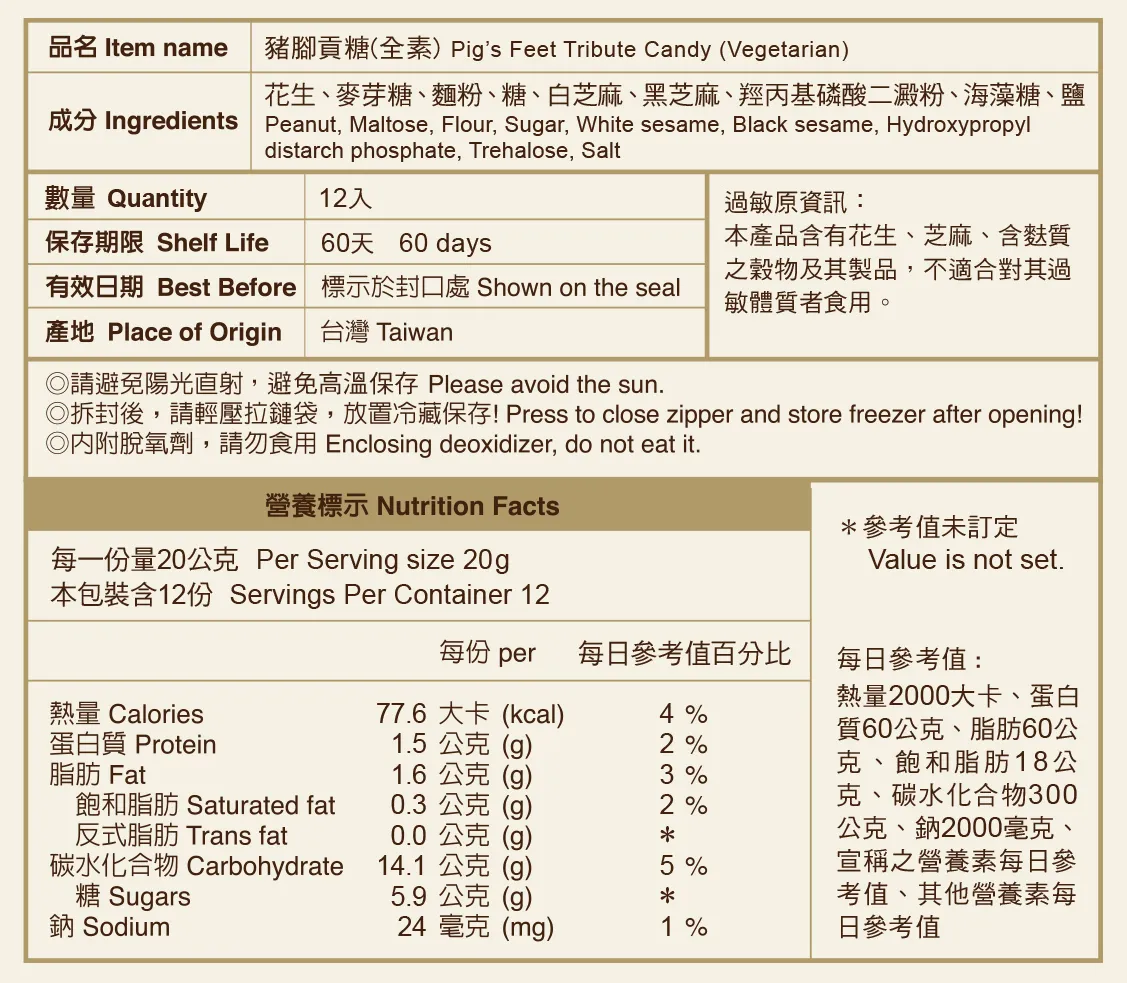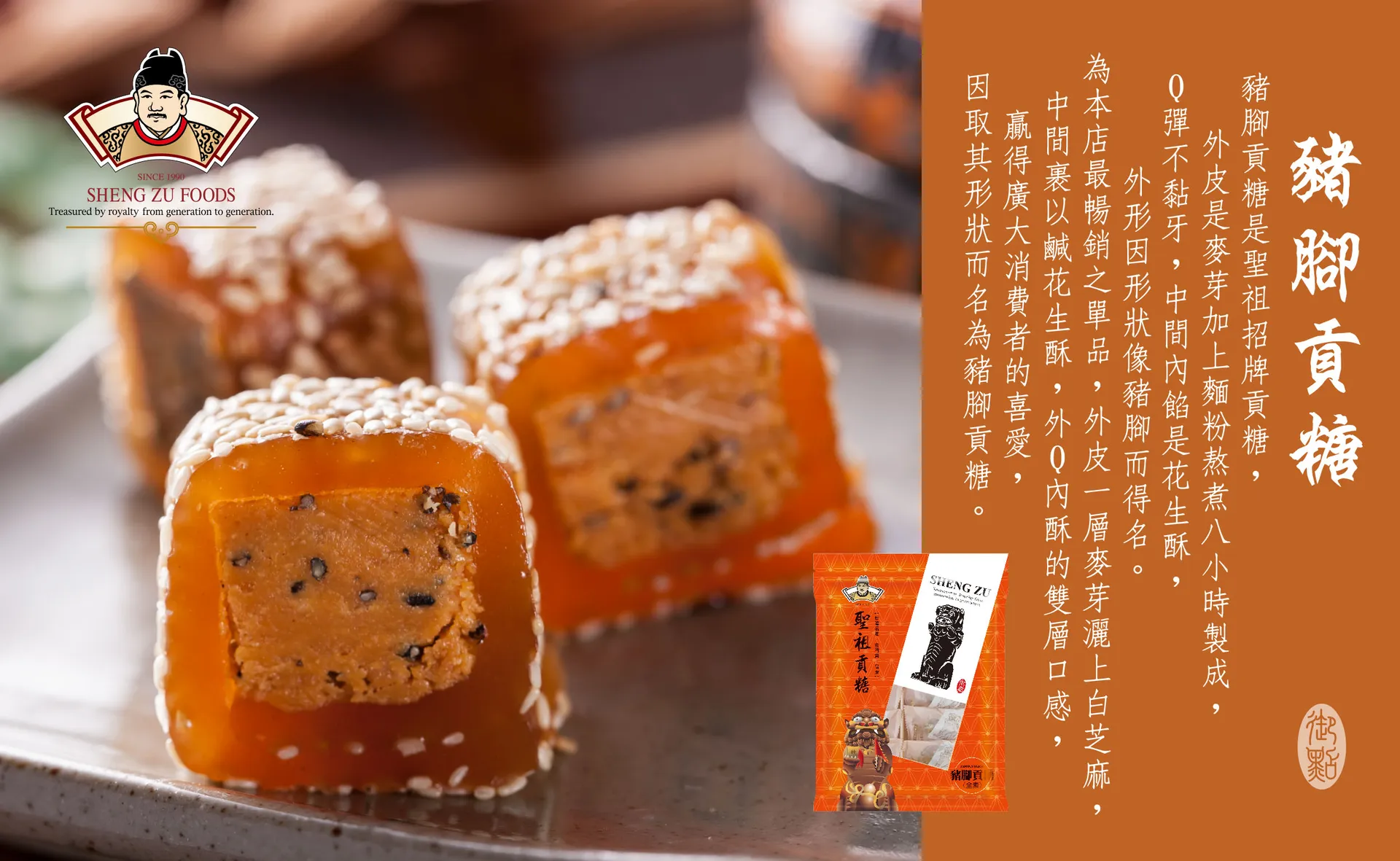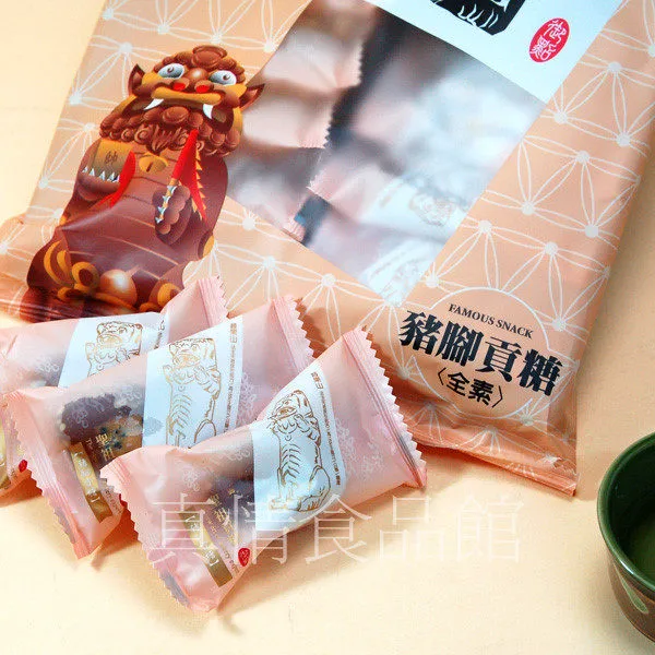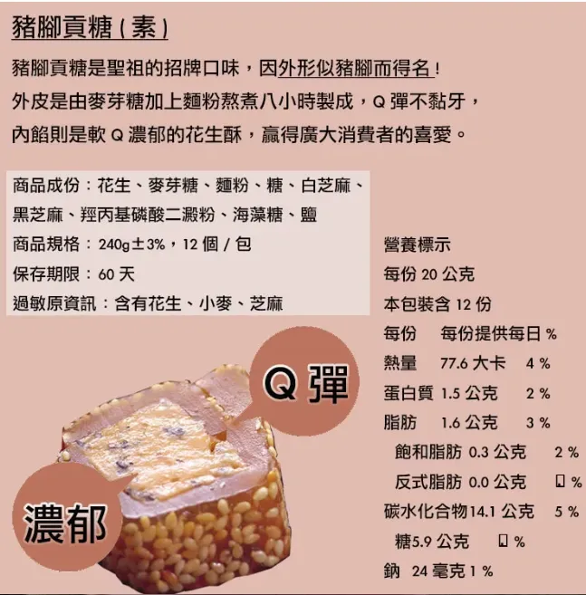 《榮獲第十六屆金峰獎》豬腳貢糖是聖祖招牌貢糖,外皮是麥芽加上麵粉熬煮八小時製成,Q彈不黏牙, 中間內餡是花生酥,外Q內酥的雙層口感,贏得廣大消費者的喜愛,外形因形似豬腳而得名。