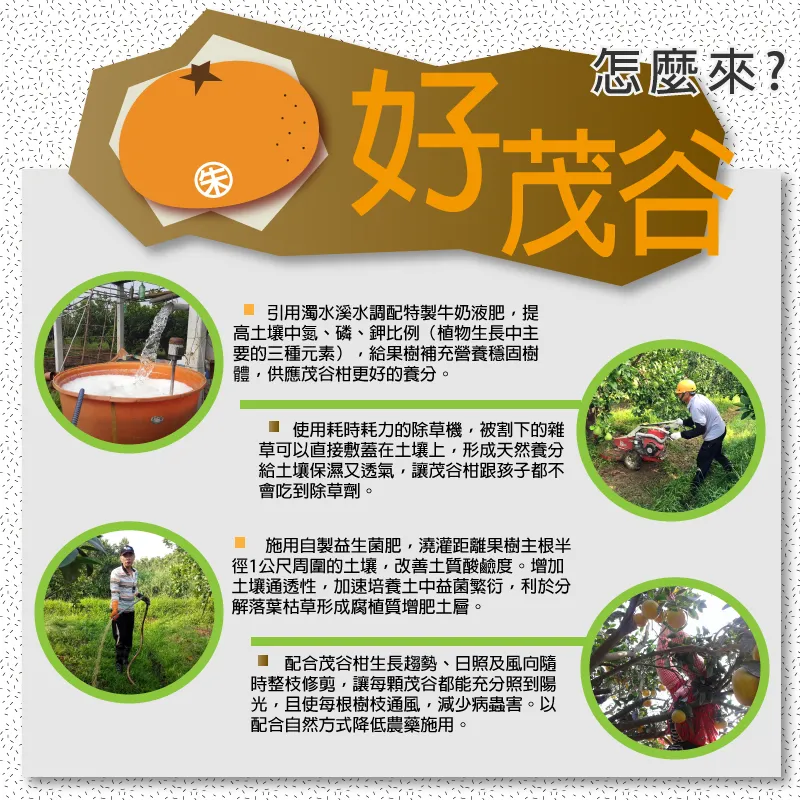 斗六重光果園採用機械式除草機,並以草生栽培維持果園生物多樣性,自製益生菌液態肥鞏固植根營養、增添果實風味。才能栽種出果肉香、甘、甜、細緻可謂汁多味美的茂谷柑,並通過產銷履歷驗證,消費者可安心品自然健康又無負擔的好滋味。