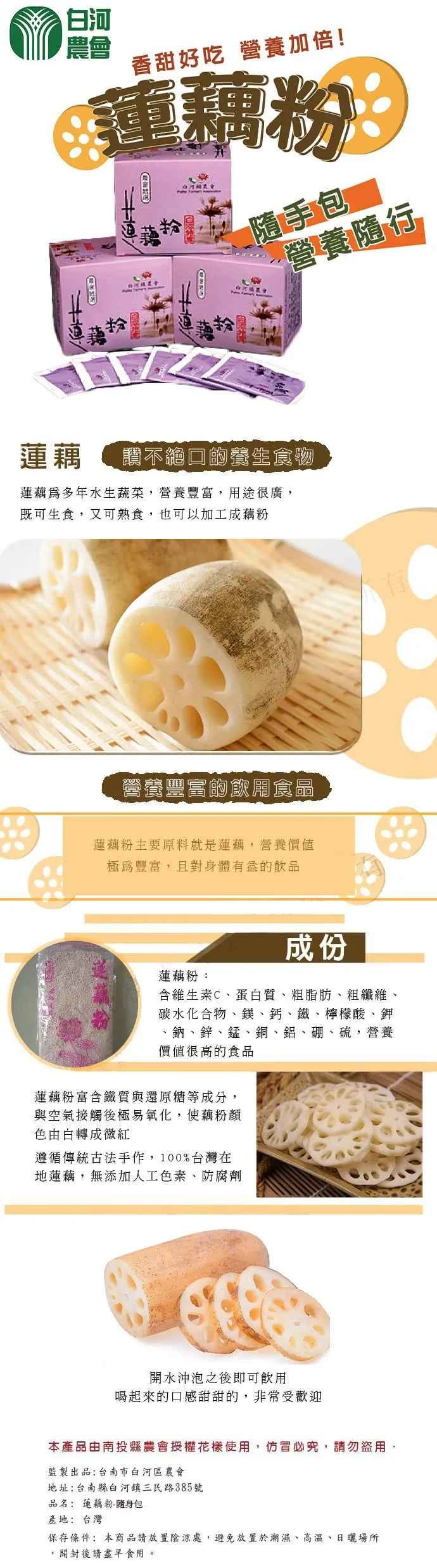 白河鎮農會出品,保證純連藕粉製造,不含太白粉、人 工色素、防腐劑或其它成份…
