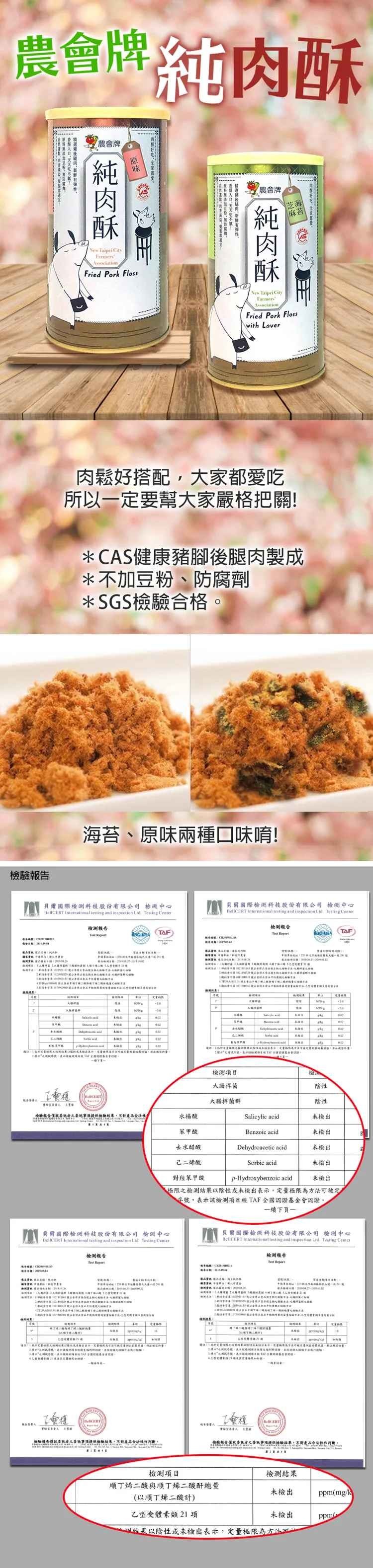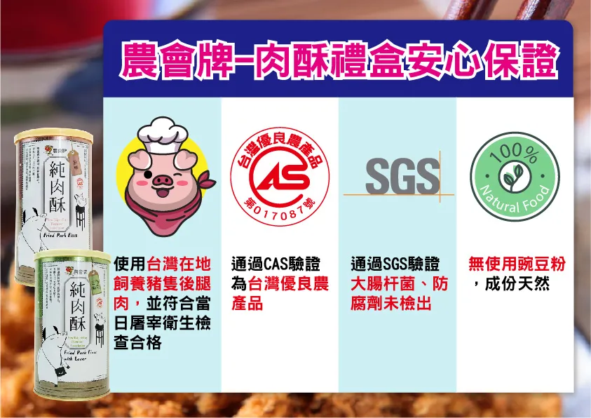 ●農會牌純肉酥,為精選健康豬腳後腿肉製成,肉質鮮美及富彈性,不加豆粉、防腐劑,SGS檢驗合格