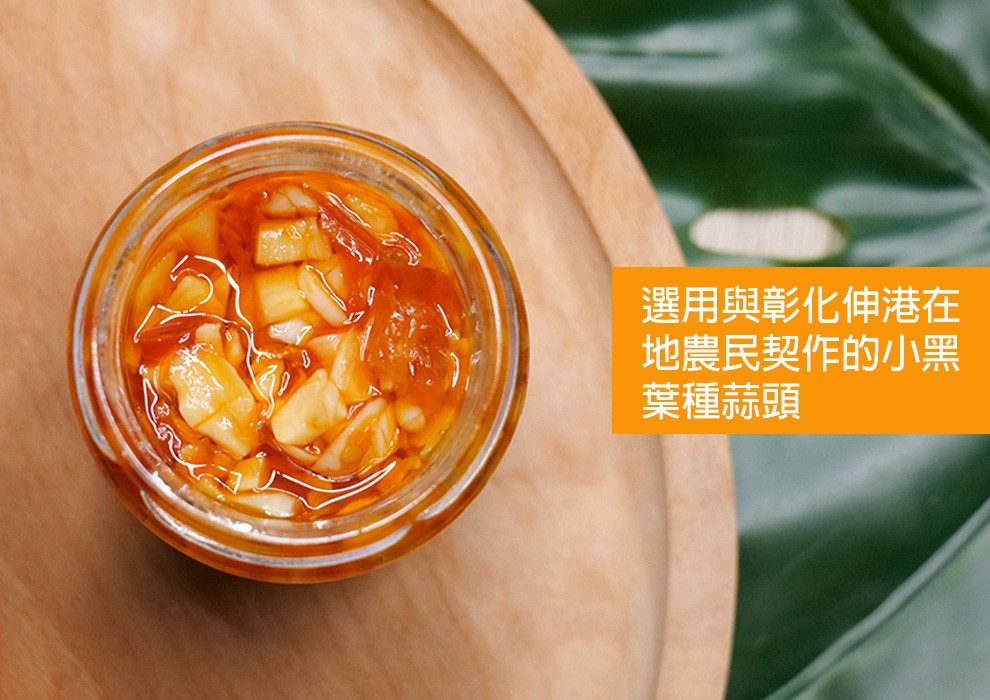 女神蒜醬選用與彰化伸港在地農民契作的小黑葉種蒜頭(辛香濃郁的紅蒜頭),在濱海氣候與土壤條件孕育下,造就出蒜香濃厚、層次豐富的風味。