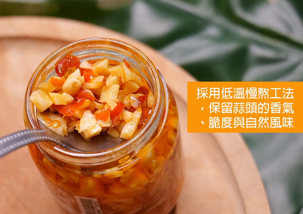 製作過程採用低溫慢熬工法,保留蒜頭的香氣、脆度與自然鮮甜完整釋放,濃縮成一罐晶亮、滑順的蒜醬。不添加防腐劑,讓你每一口都吃得安心又滿足。