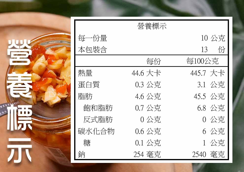 成份:蒜頭、辣椒、黃豆油、鹽、小茴香、花椒、甘草、肉桂、月桂、桂枝、丁香、五加皮、山奈、白芷、香料、乳酸鈣、L-麩酸鈉、琥珀酸二鈉、5’-次黃嘌呤核苷磷酸二鈉、5’-鳥嘌呤核苷磷酸二鈉、檸檬酸